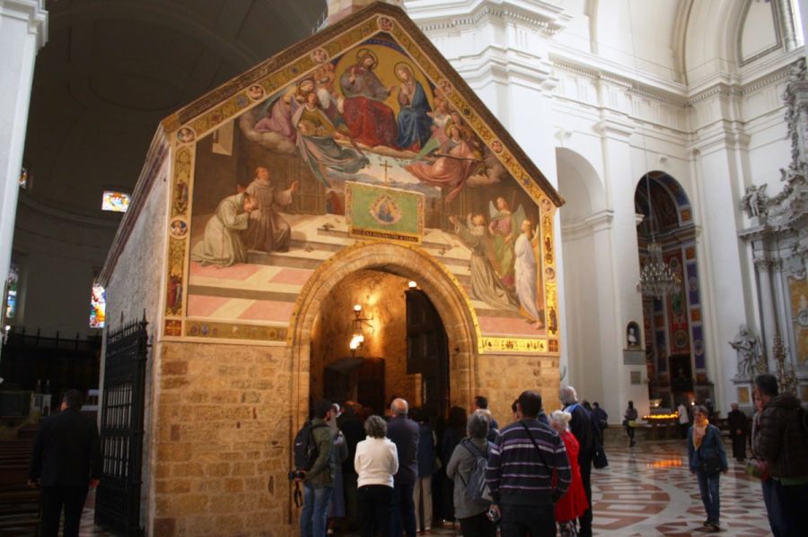 W roku 1415 św. Bernardyn ze Sieny osadził tu swoich synów duchowych, obserwantów. Wystawili oni tu spory klasztor, a także okazały kościół. W latach 1569-1678 wystawiono świątynię, którą dzisiaj oglądamy. Wieża - dzwonnica pochodzi z roku 1684. Franciszek Overbeck wykonał malowidła i mozaiki wewnątrz (1829-1830). W roku 1832 trzęsienie ziemi zniszczyło znacznie kościół. Odbudowany został rychło w latach 1836-1840. Świątynia posiada okazałą fasadę z figurą Matki Bożej na szczycie, wykonaną z brązu pozłacanego, liczącą 7 metrów wysokości. W środku kościoła znajduje się w stanie surowym zachowany pierwotny kościółek - kaplica. Przy końcu bocznej nawy jest cela, ozdobiona freskami Tyberiusza z Asyżu (1516), w której mieszkał i dokonał życia św. Franciszek. W maleńkim ogrodzie rosną dzikie, czerwone róże bez kolców. Legenda głosi, że w ten właśnie krzak rzucił się dnia pewnego św. Franciszek dla umartwienia ciała. Ponieważ bardzo go wówczas kolce poraniły, za karę z woli Bożej przestały rodzić kolce i tak jest po dzień dzisiejszy. Listki tych róż rozdaje się na pamiątkę. Legenda głosi również, że raz po raz pojawiają się na różach krople krwi Świętego.